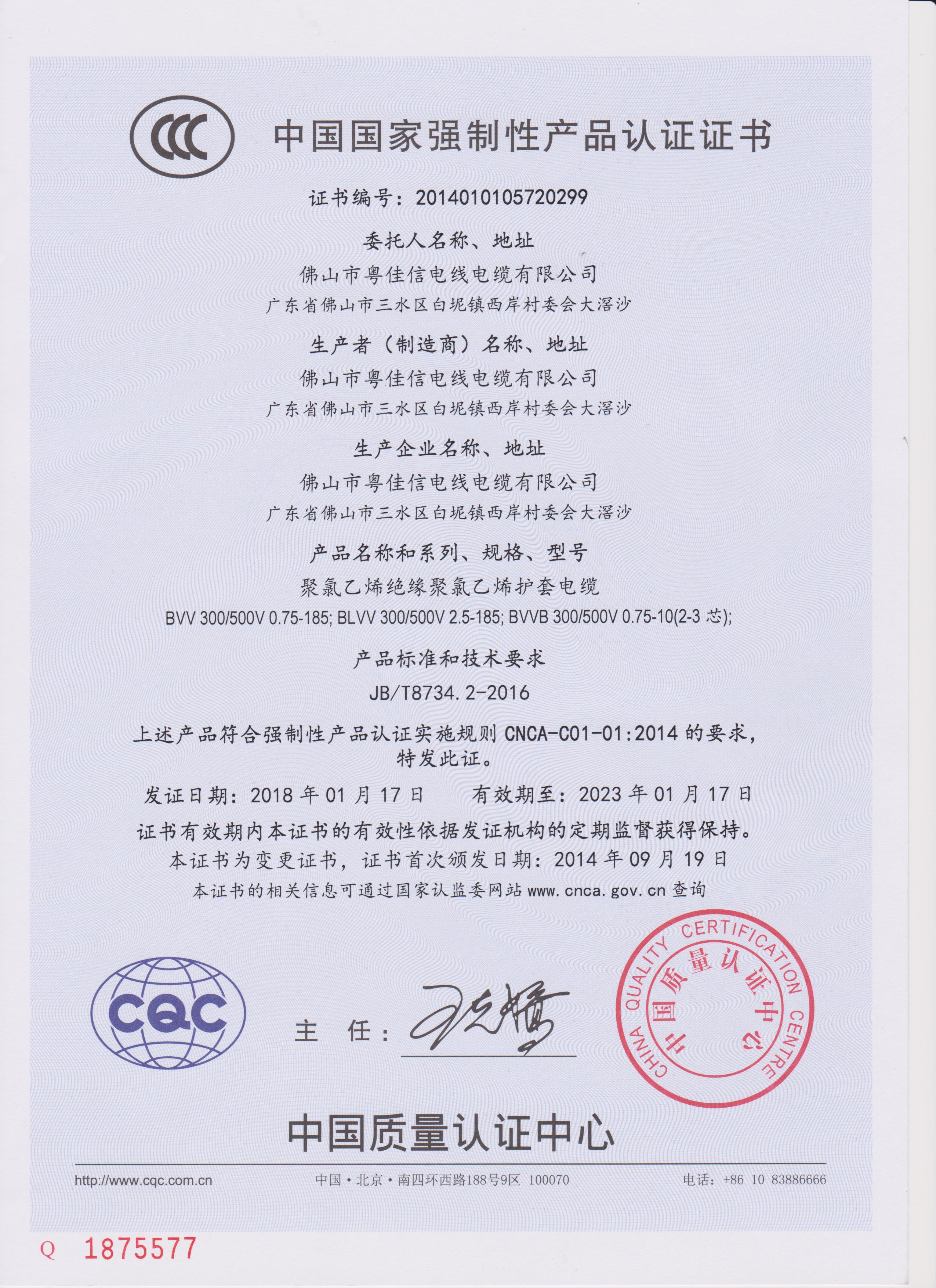 二、粵佳信公司有全國(guó)工業(yè)產(chǎn)品生產(chǎn)許可證(電線(xiàn)電纜)、CCC中國(guó)國(guó)家強(qiáng)制性產(chǎn)品認(rèn)證證書(shū)、ISO9001認(rèn)證等證書(shū),這幾類(lèi)證書(shū)是電線(xiàn)電纜企業(yè)必備的生產(chǎn)經(jīng)營(yíng)許可證及企業(yè)質(zhì)量管理水平的標(biāo)志。