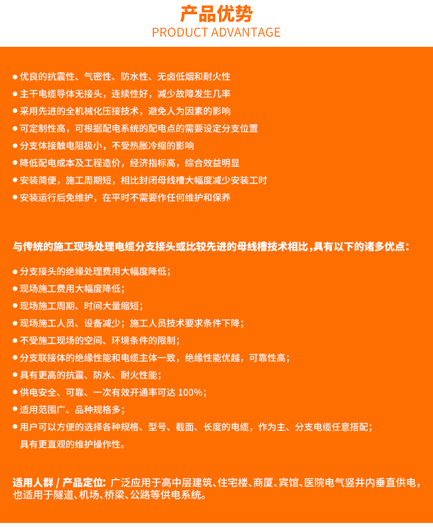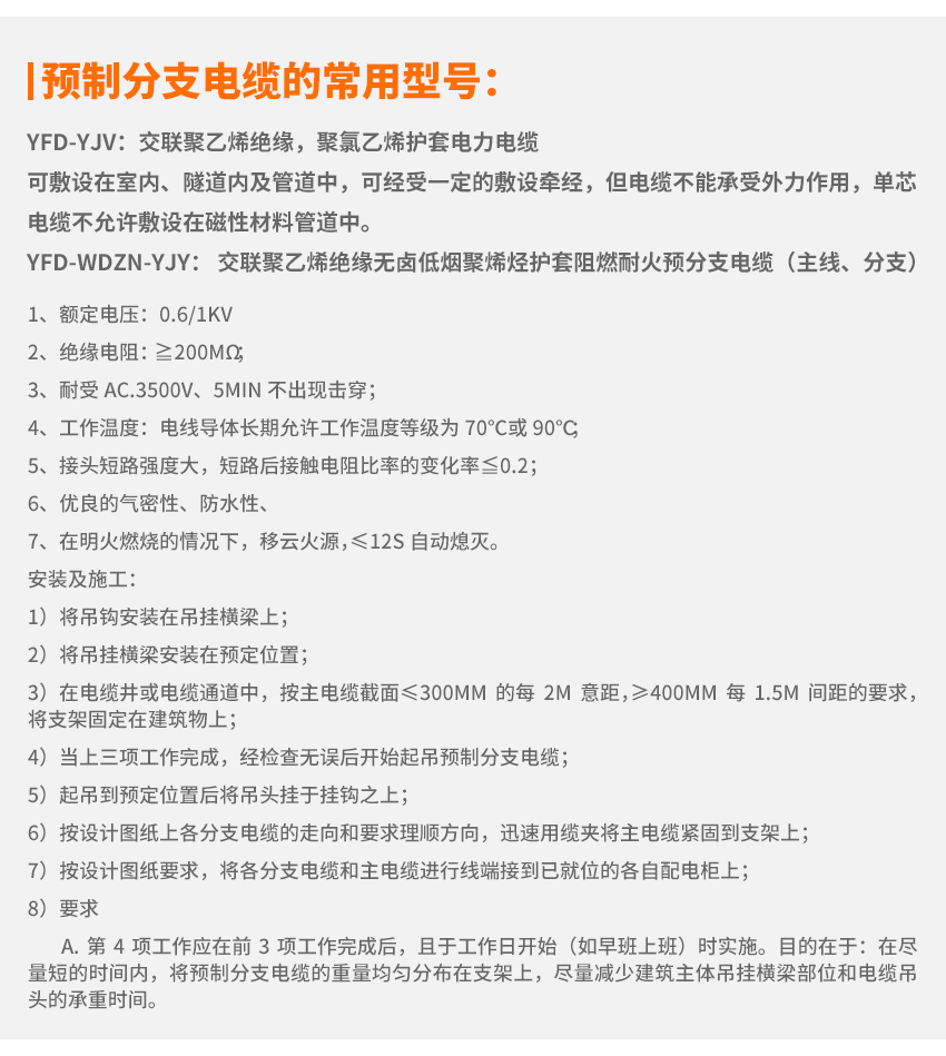 分支線工廠預先制造在主干電纜上,分支線截面大小和分支線長度等是根據設計要求決定,極大縮短了施工周期大幅度減少材料費用和施工費用更大地保證了配電的可靠性。